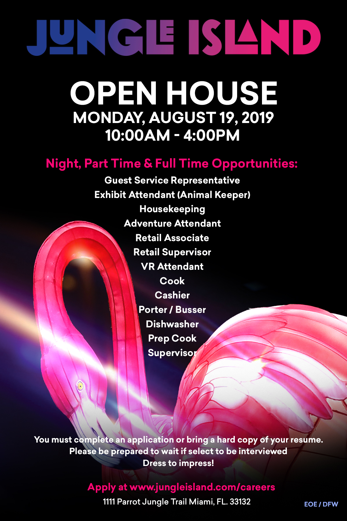 Jungle Island is a Drug Free Workplace and an Equal Opportunity Employer. Employment decisions are made without regard to race, color, religion, national or ethnic origin, sex, sexual orientation, gender identity or expression, age, disability, protected veteran status or other characteristics protected by law.
